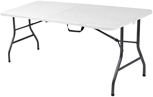 Ontario Furniture 6 Foot Plastic Folding Table - Folds in Half with Carrying Handle Rectangular - Lightweight and Portable - White Resin with Sturdy Steel Frame